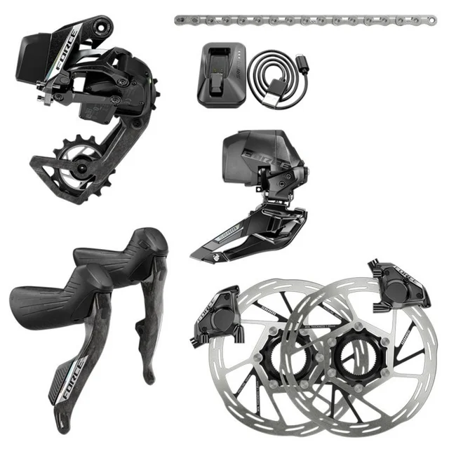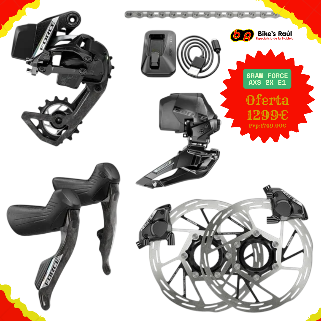 Grupo electrónico FORCE AXS 2x E1 que incluye: cambio trasero, desviador delantero, manetas de cambio y freno, cadena, pinzas de freno de disco, discos.